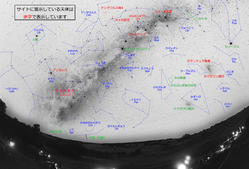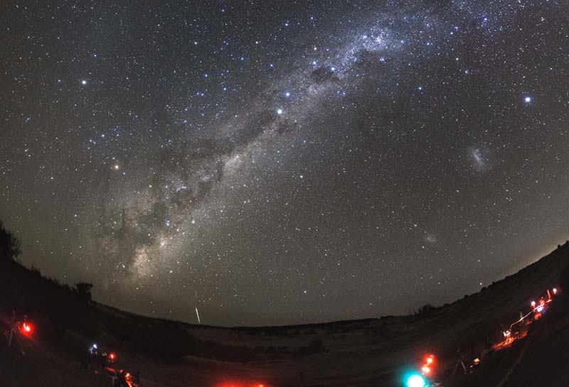 上の写真は東から昇ってきた天の川銀河とオーストラリア遠征隊を撮影したものです。南天を代表する大・小マゼラン雲・カリーナ星雲・オメガ星団・南十字などの天体が、十分な高度に達した時点で魚眼レンズで狙いました。撮影中、明るい流星が出現し色を添えてくれました。遠征隊は天候がよければ午後7時頃から翌朝6時頃まで、写真撮影したり観測したりします。星はスッキリと美しく、日本など北半球から見えない天体を見ることができることが、南半球の魅力です。