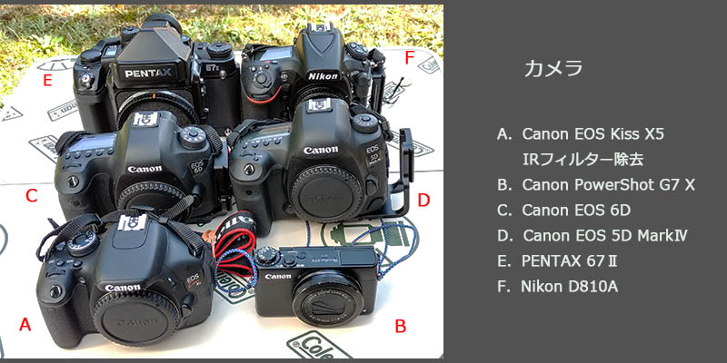 現在使用している主要なカメラ・三脚・雲台について紹介します。このサイトで使われてる機材であっても現在使用していない、もしくは既に売却処分してしまった機材を除きます。(2017/10)