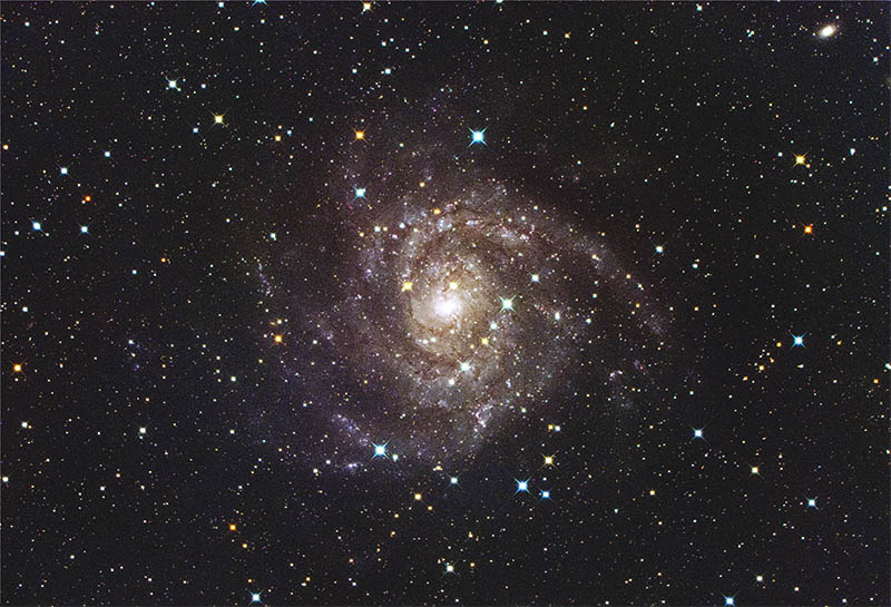 くすぶるIC342銀河に対し、手前の天の川銀河に属する恒星は色とりどりに明るく輝いています。この写真は星の明るさや大きさを押さえることなく星の色を出しました。