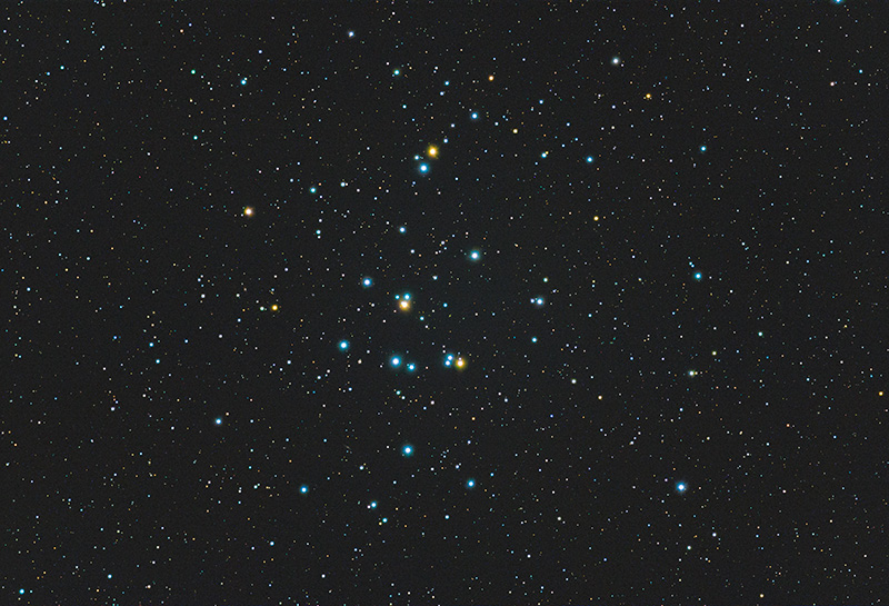 117′×80′ ですから、プレセペ星団のほぼ全景が収まっていると考えていいと思います。この星団の明るい星の多くは中心部に集まり、6等星から6.5等星の白色~青白色(スペクトル型A型)に輝きます。しかし、その中にいくつかの黄色味を帯びた赤色巨星が散らばり、むしろ全体的にはM型系の赤い星が多いといわれています。(2026/01)