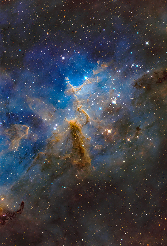Melotte15 散開星団は、写真「ハート星雲IC1805 と IC1795」のページで、「ハート星雲は中心にあるMelotte15と呼ばれる生まれたての散開星団からの放射により発光しています」と紹介しました。上の写真はこのMelotte15とその周辺を長焦点望遠鏡で撮影しました。造形と色彩が大変魅力的な星域です。今回もナローバンドによるSHO合成としました。