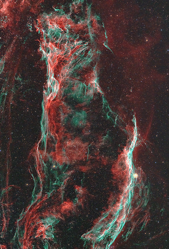 太陽より数倍の質量を持った恒星が、最後に大爆発(超新星爆発)を起こし一生を終え、周辺に残骸をまき散らしているはくちょう座の網状星雲。何回か撮影していて今回は西側の様子を狙いました。写真右下に「NGC6960」、写真上部の逆三角形の明るい星雲はピッカリングの三角形と呼ばれています。網状星雲の全景写真「網状星雲」でこの写真の位置が確認できます。
