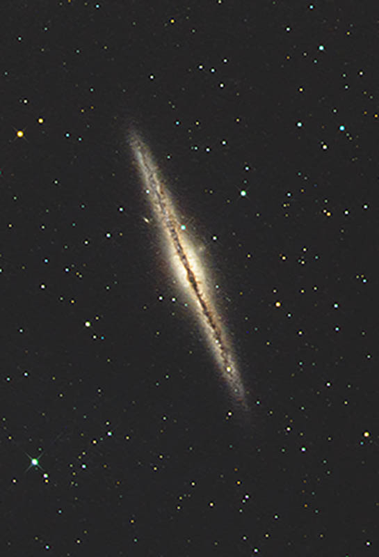 私たちが住む天の川銀河のような渦巻銀河を横から見た銀河をエッジオン銀河と言いますが、その代表格の一つであるアンドロメダ座にあるNGC891銀河です。下のトリミングの無い写真には他に5個程度の銀河と、NGC891銀河に寄り添うように伴銀河らしきものが2天体確認できます。春と秋の星座は遠くの銀河を見通せるため銀河撮影のチャンスです。