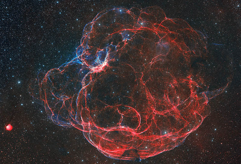撮影機材はモノクロCMOSカメラを使い、Redチャンネルに水素のHα画像、GreenとBlueチャンネルに酸素のOⅢ画像を割り当ててHOO合成しています。また今回から「星なし画像」の作成に、StarXTerminatorをPhotoshopのプラグインとして使用しています。RC