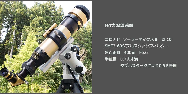 Hα太陽望遠鏡は、太陽を眼視で観測することのできる専用の望遠鏡です。太陽面を投影する従来の方法では、黒点は確認できますが、プロミネンスなどは見ることはできません。望遠鏡本体はテレスコ工作工房さんより検品後のused品を購入し、鏡筒先端に装着されているダブルスタックフィルターは、ジズコさんから良好な組み合わせ品を選んでいただきました。ダブルスタックフィルターを装着することにより光量は落ちましたが、彩層面のコントラストは向上しプロミネンスだけでなく、プラージュ、ダークフィラメント、フレアなどの細部を確認しやすくなりました。勿論、このような微細部分の見え方は、観測時のシーイングなどの影響を大きく受けることは言うまでもありません。