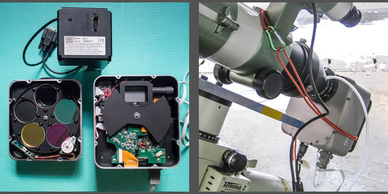 写真右は、PENTAX 105SDP鏡筒に接続しています。赤い登山ロープは落下防止(実績あり)、半透明のチューブは乾燥空気の送出、黒コードはファインダーのヒーターです。