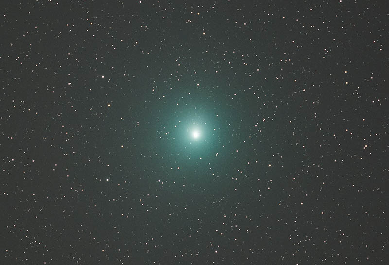 移動するウィルタネン彗星とすばる星団の天球上の距離や構図から、17日の撮影を狙っていましたが遠征でも晴れ間が期待できず、16日の撮影になりました。夜半から星空が見えるようになり、雪国では久しぶりの快晴に恵まれました。既に公開されている写真から彗星の光芒が丸く写ることや、すばる星団が写野の端になることから、開放絞りから2段絞り写野周辺のレンズ収差を押さえ、さらに一般的な彗星のコアによる合成でなく恒星による8枚合成とし、星とすばる星団を点像にしました。